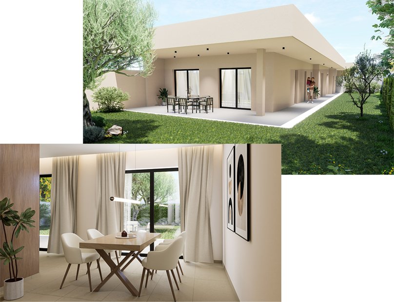 Un progetto residenziale composto da tre ville indipendenti al piano terra, pensato per chi cerca privacy, comfort e spazi esterni esclusivi.